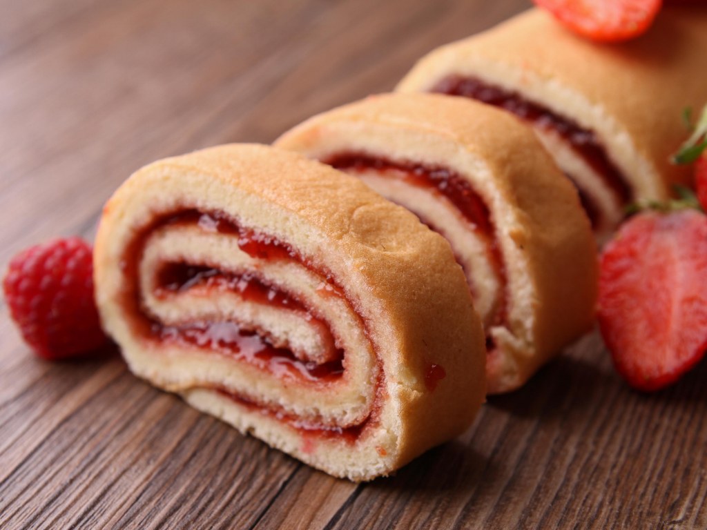 Après la cuisson, retourner immédiatement le biscuit sur le papier saupoudré de sucre. Retirer le papier parchemin du dessus. Enduire le biscuit de confiture et le rouler.