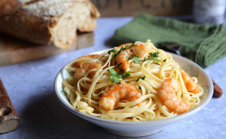 Décortiquez les crevettes. Rincez et essorez les jeunes pousses d'épinards. Râpez le parmesan. Placez la moitié du parmesan dans un bol et ajoutez 1 louche d'eau de cuisson des pâtes tout en fouettant. Incorporez