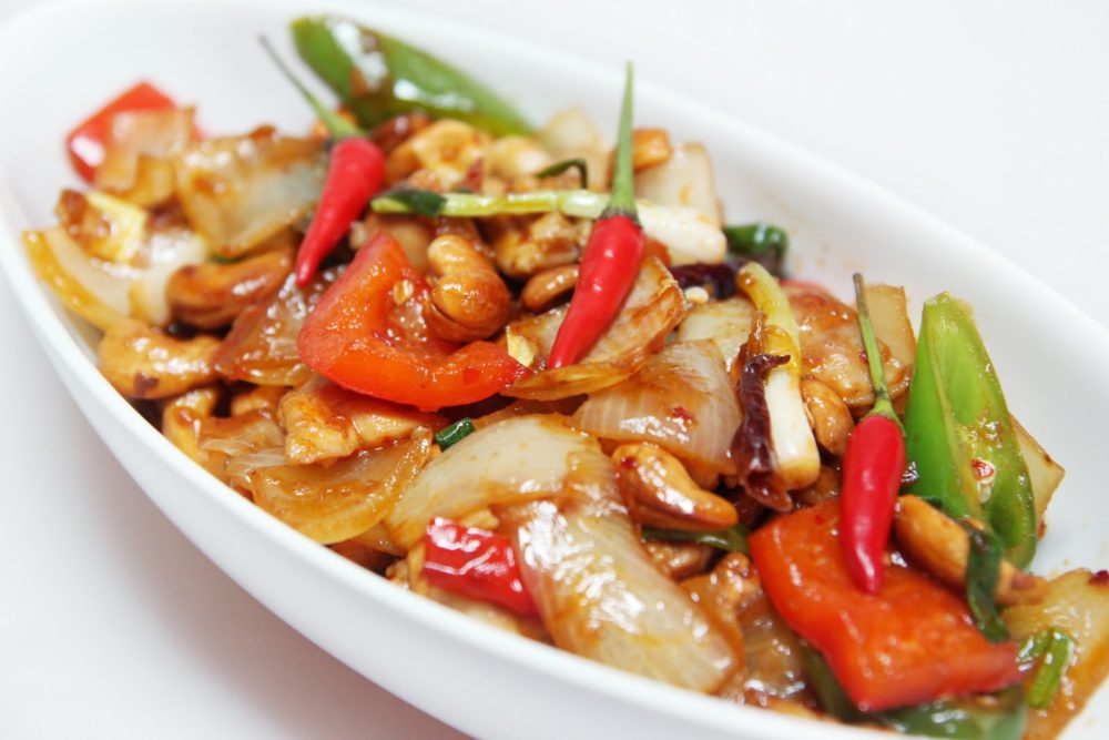 Un poulet moelleux, parfaitement pimenté, avec ses oignons, poivrons rouges, de gros piments verts et surtout ses noix de cajou croquantes.