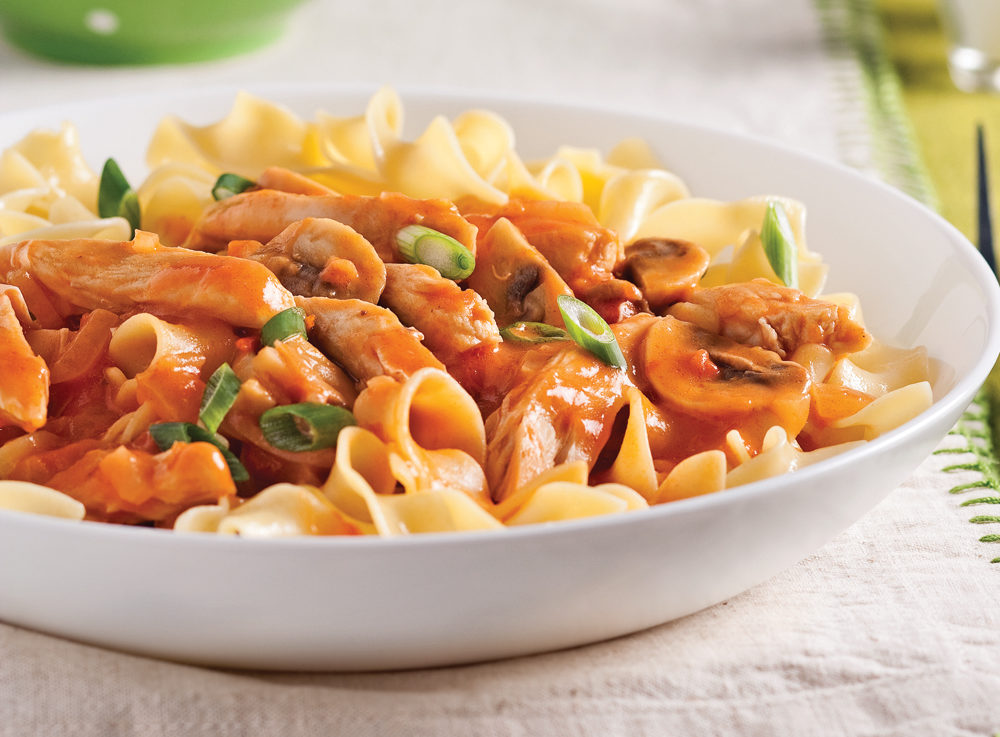 Délicieux émincé de poulet dans une sauce crème aux champignons, poivrons et cornichons.