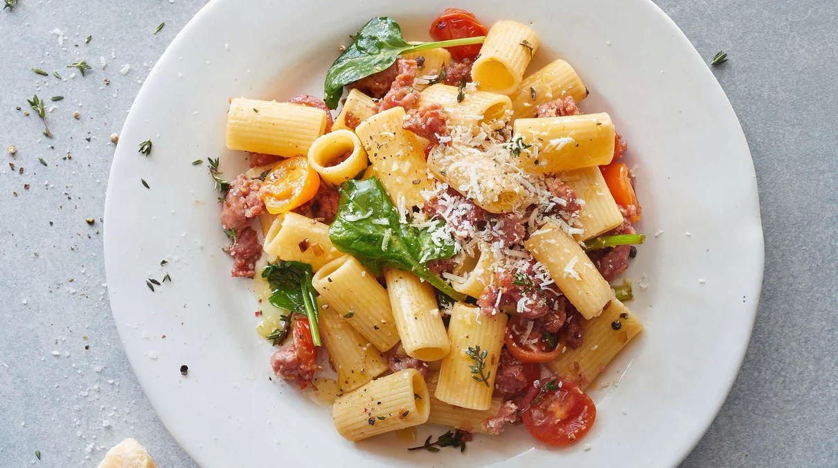 Extraire la chair des saucisses puis la morceler grossièrement. Hacher l'échalote et l'ail. Couper les tomates en deux. Effeuiller le thym. Cuire les rigatoni al dente dans un grand volume d'eau salée. Entre-temps, chauffer l'huile d'olive dans une grande poêle. Faire revenir la chair des salsiccie, l'ail, l'échalote, les tomates et le thym durant env. 5 min en remuant. Égoutter les pâtes et les mélanger à la sauce avec les épinards. Dresser, râper du parmesan par-dessus et servir.