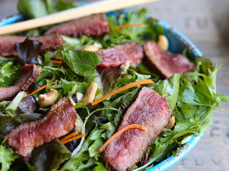 Disposer le boeuf sur le plat et parsemer de cacahuètes concassées et échalote frite