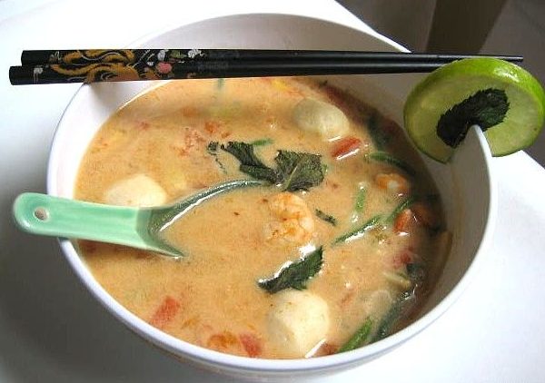 Répartir les autres ingrédients dans des bols à soupe, arroser de soupe.