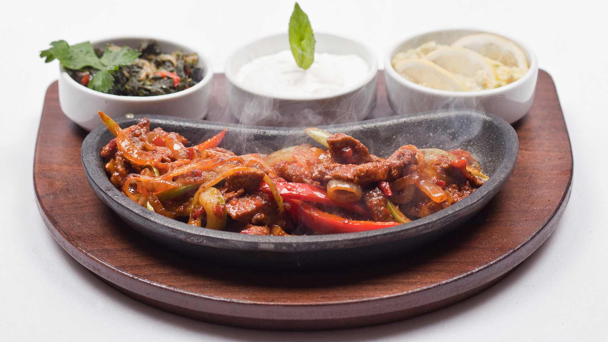 Poser la viande sur le plat préalablement chauffé, en ajoutant le riz et les tomates et en garnissant les tournedos avec les tranches d'orange passées un moment dans le jus de cuisson, les olives noires et le persil.